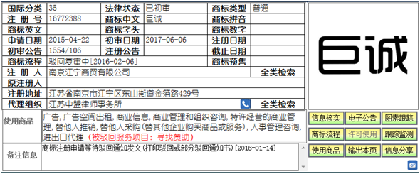 2016年1月,我所提交的“巨誠(chéng)”商標(biāo)因李曉偉名下的“巨誠(chéng)”商標(biāo)被駁回,江寧商貿(mào)公司委托我所提起了駁回復(fù)審程序。2016年12月,李曉偉名下“巨誠(chéng)”商標(biāo)被成功撤銷,雖然李曉偉后續(xù)提交了“巨誠(chéng)”商標(biāo)的撤銷復(fù)審程序,但是因其證據(jù)缺乏,該商標(biāo)終究被歸于無(wú)效。因此,在解決了在先障礙商標(biāo)的情況下,最終被異議人江寧商貿(mào)公司名下的“巨誠(chéng)”商標(biāo)也迎來(lái)了其駁回復(fù)審的成功,江寧商貿(mào)公司申請(qǐng)的“巨誠(chéng)”商標(biāo)于2017年6月6日被商標(biāo)局予以初步審定并公告。