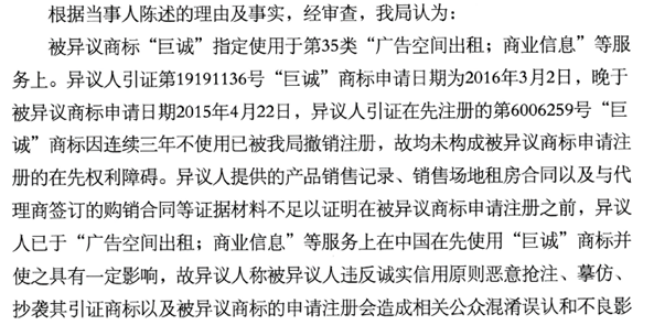 被異議的“巨誠(chéng)”商標(biāo):