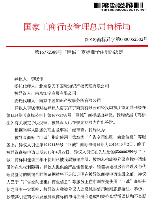 然而,“巨誠(chéng)”商標(biāo)的爭(zhēng)奪之戰(zhàn)并未因此結(jié)束,2017年7月,異議人李曉偉針對(duì)我所代理的江寧商貿(mào)公司名下的“巨誠(chéng)”商標(biāo)提起了異議程序。在江寧商貿(mào)公司的委托及積極配合下,我所進(jìn)行了異議答辯。 我所于2018年12月20日收到商標(biāo)局下發(fā)的準(zhǔn)予注冊(cè)決定書(shū),李曉偉的異議理由不成立,第35類16772388號(hào)“巨誠(chéng)”商標(biāo)成功準(zhǔn)予注冊(cè)!