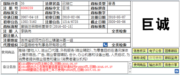 江寧商貿(mào)公司在南京地區(qū)開(kāi)設(shè)了多家“巨誠(chéng)”超市,在運(yùn)營(yíng)過(guò)程中發(fā)現(xiàn)“巨誠(chéng)”商標(biāo)已經(jīng)被吉林省蛟河市白石山鎮(zhèn)建興委一組的李曉偉于2007年4月18日提交了注冊(cè)申請(qǐng),并于2010年5月7日被商標(biāo)局核準(zhǔn)注冊(cè)。在此情況下,江寧商貿(mào)公司征詢了我所的建議,在詳細(xì)調(diào)查了李曉偉及其名下“巨誠(chéng)”商標(biāo)的使用情況后,發(fā)現(xiàn)該商標(biāo)并沒(méi)有處于使用狀態(tài),因此,在委托我所提交“巨誠(chéng)”商標(biāo)的注冊(cè)申請(qǐng)的同時(shí),對(duì)該李曉偉名下“巨誠(chéng)”商標(biāo)提起了撤三程序。