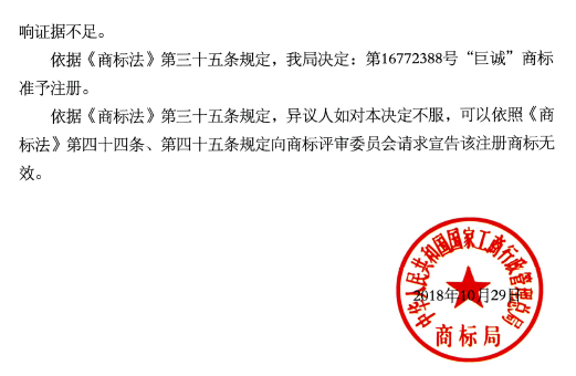 2)“巨誠(chéng)”商標(biāo)準(zhǔn)予注冊(cè)決定書(shū)