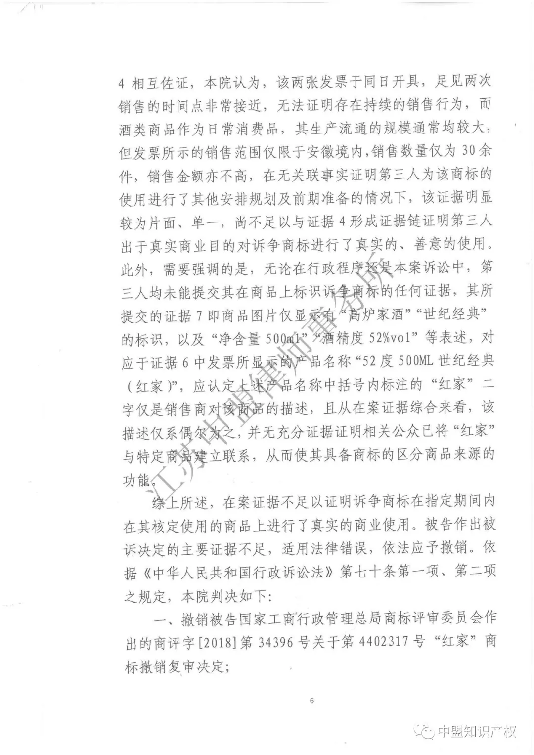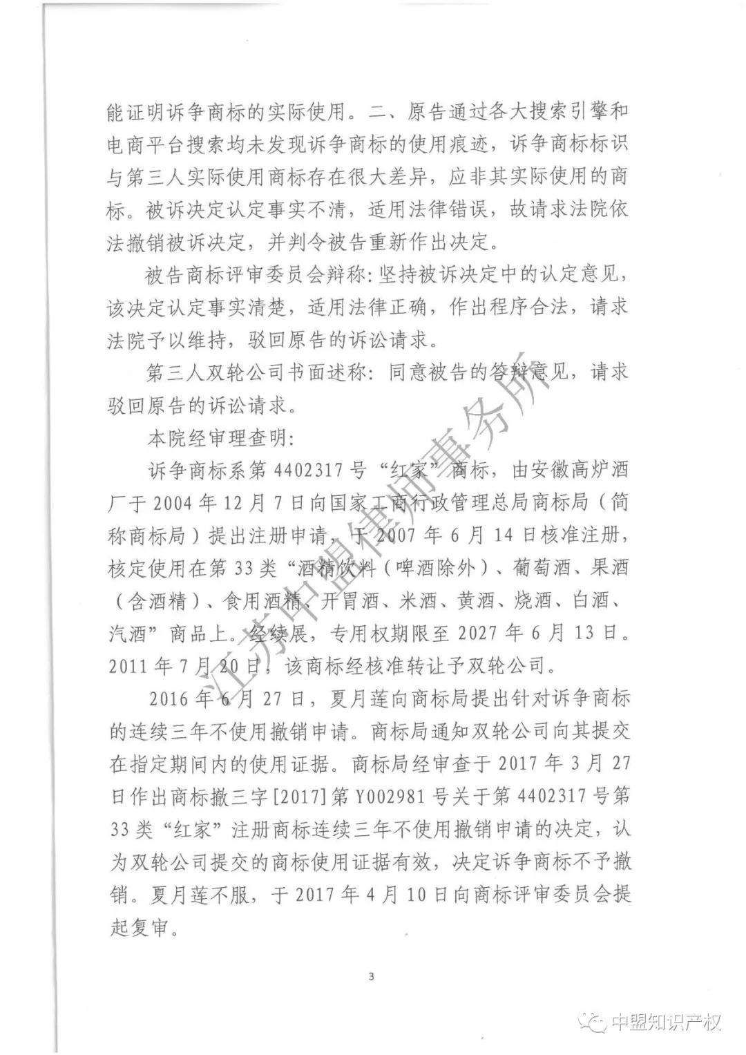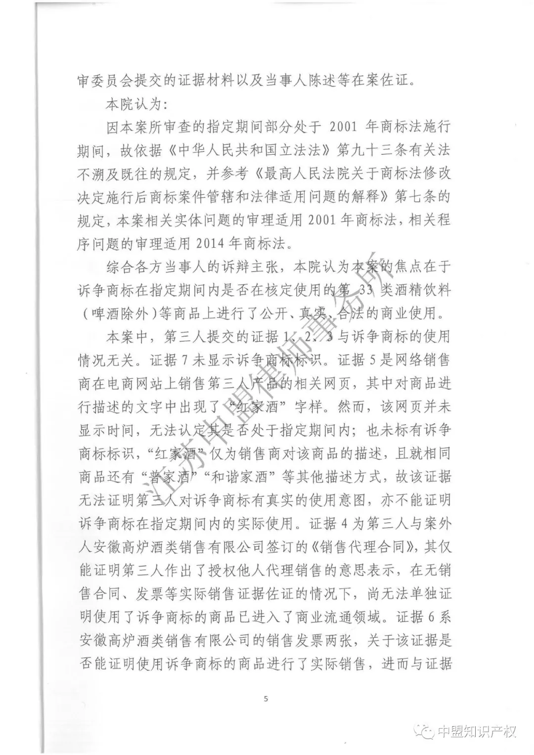 在撤銷復(fù)審階段,雙輪公司向商評委提交了其在指定期間使用訴爭商標(biāo)的證據(jù),主要包括與安徽高爐酒類銷售有限公司簽訂的《銷售代理合同》、2張銷售發(fā)票、銷售網(wǎng)站上的商品截圖以及一些其他主體資質(zhì)文件等。商評委通過審查后認(rèn)為上述證據(jù)能夠證明雙輪公司對訴爭商標(biāo)進(jìn)行了真實(shí)、有效、合法的使用,因此于2018年2月28日做出決定,對訴爭商標(biāo)的注冊予以維持。