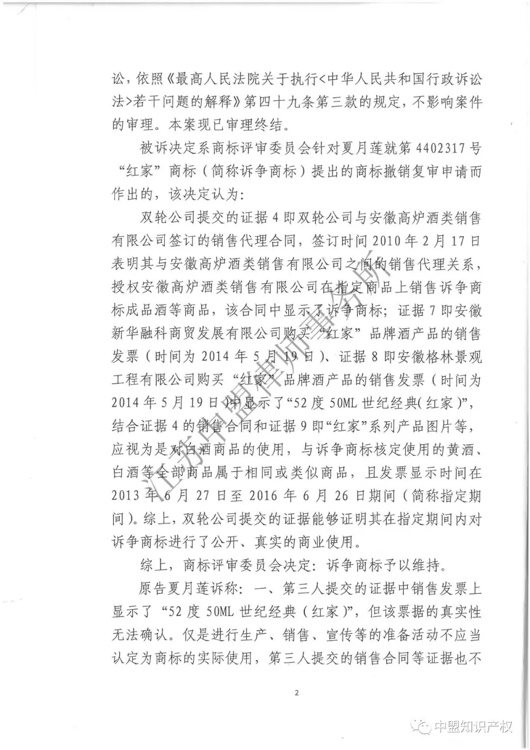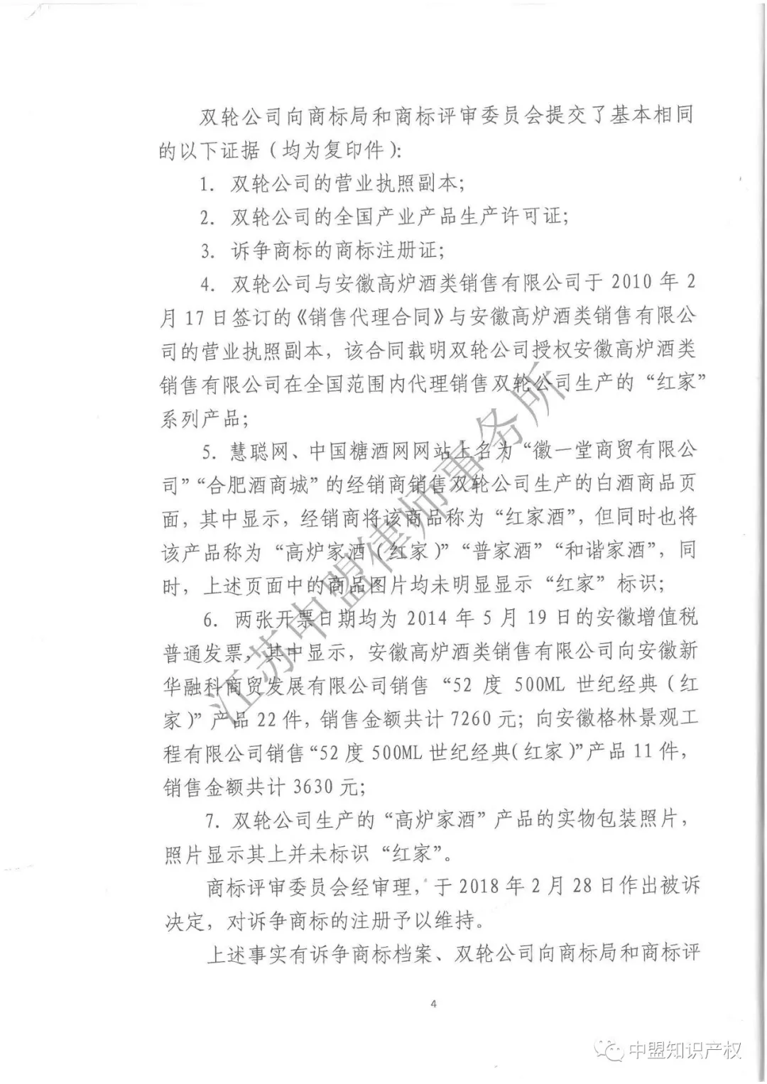 2、向法院提出安徽雙輪酒業(yè)公司名下無任何“紅家”商標(biāo)標(biāo)識(shí)的使用證據(jù)存在,已提供的證據(jù),不足以證明其“紅家”商標(biāo)的實(shí)際使用,僅僅能證明“高爐家”商標(biāo)品牌的實(shí)際使用。
