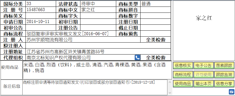 當(dāng)事人蘇州宇順物流有限公司在2014年10月11日向商標(biāo)局申請注冊“家之紅”商標(biāo),該商標(biāo)的使用商品項(xiàng)目是“米酒,白酒,烈酒(飲料),威士忌,清酒,汽酒,青稞酒,黃酒,果酒(含酒精),燒酒”,但該商標(biāo)在商標(biāo)初審階段就因?yàn)榕c“紅家”商標(biāo)近似度較高而被駁回,我所在繼續(xù)為當(dāng)事人針對“家之紅”商標(biāo)進(jìn)行駁回復(fù)審程序的同時(shí),了解到“紅家”商標(biāo)的權(quán)利人雙輪公司在近三年并未在該商標(biāo)指定的商品類別上對其有任何實(shí)際使用,因此我所夏月蓮女士受蘇州宇順物流有限公司的委托,以其名義于2016年6月27日對“紅家”商標(biāo)提起了連續(xù)三年不使用撤銷程序,通過撤銷訴爭商標(biāo),排除當(dāng)事人商標(biāo)申請的在先權(quán)利障礙。