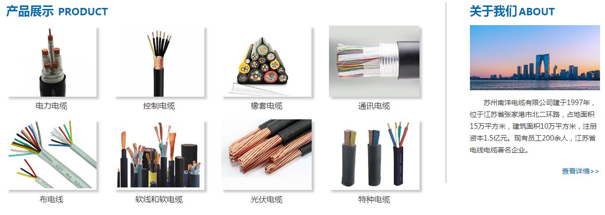 蘇州南洋電纜有限公司建于1997年,位于江蘇省張家港市北二環(huán)路,占地面積15萬(wàn)平方米,建筑面積10萬(wàn)平方米,注冊(cè)資本1.5億元。現(xiàn)有員工200余人,江蘇省電線電纜著名企業(yè)。
