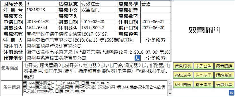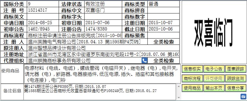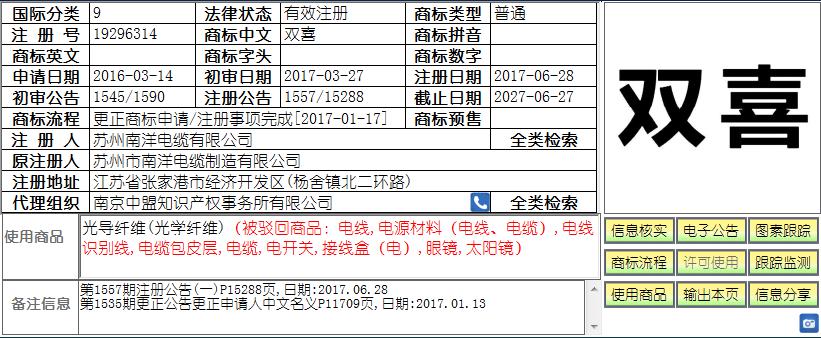 2017年8月,我所通過(guò)對(duì)“蘇州南洋電纜有限公司”名下商標(biāo)的監(jiān)測(cè)及管理中發(fā)現(xiàn),在涉及公司的核心第9類“電纜;電線;電源材料(電線、電纜);電阻材料等”具體商品項(xiàng)目上,有兩件“雙喜臨門”商標(biāo)被商標(biāo)局成功核準(zhǔn)注冊(cè),其商標(biāo)注冊(cè)號(hào)分別為第15214317號(hào)和第19818748號(hào)。